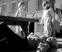I admit that the contamination suits look a little dumb, with their clunky over-the-street-shoes feet. But maybe real ones look like that, and there's no way around it. I think Bill Koenig has mentioned the strong similarity between the opening scene at the Scottish village, here, and scenes in "The Andromeda Strain" where the scientists examine the corpses at the dead Arizona town. Michael Crichton could have seen this and been inspired by it; he'd have been in college at the time.
